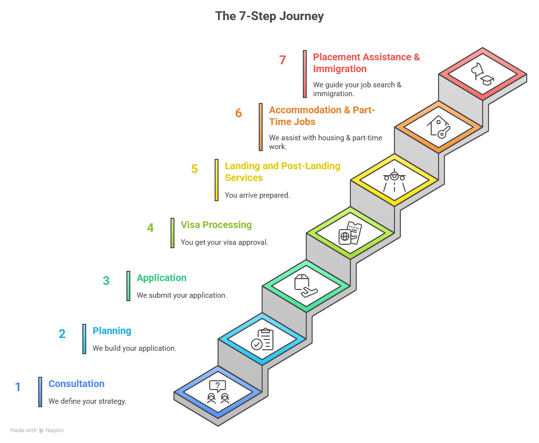 Your high-returns investment covers everything from guidance in initial counseling of colleges abroad to admission, landing services, residential accommodation, part-time job assistance, and internship guidance; in the country of your choice.
